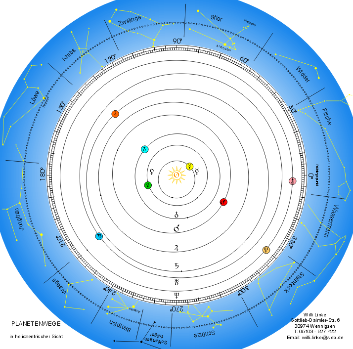 Mit den beigefügten heliozentrischen Ephemeriden können sie die genauen Positionen der magnetischen Planeten (8mm) auch für die nächsten Jahre einstellen.
